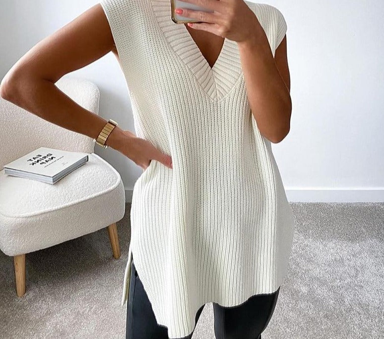 The sweater vest gets a reboot with this sleeveless knitted summer top. Relaxed fit will pair with skinny jeans or leggings. V-neck to show off your favorite lariat. Side slit detail to keep you cool day and night.