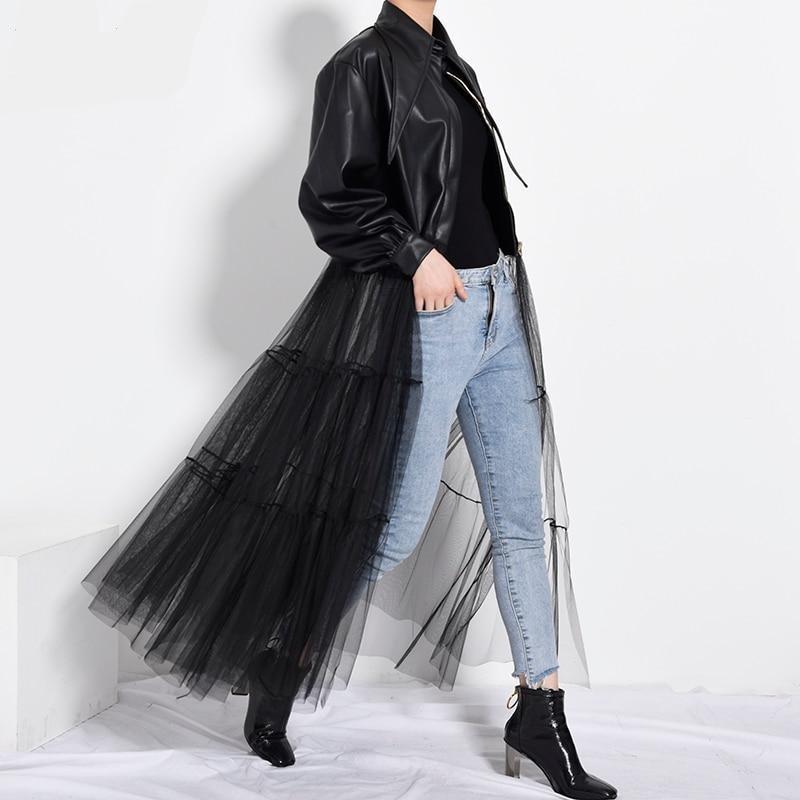 Add gothic elegance to your fall wardrobe with this long faux leather and tulle coat. Classic Moto jacket on top with tulle skirt on the bottom merges edgy urban with victorian gothic. Pair over jeans or a classic black dress.