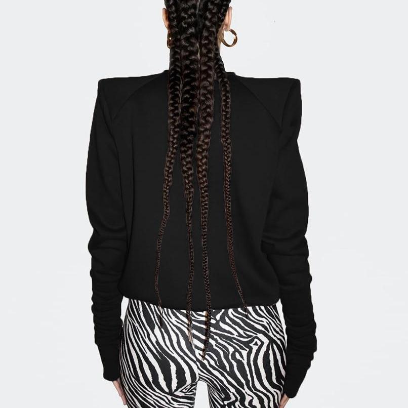Impressive shoulder pads can add drama and retro elegance to your winter wardrobe. V-neckline with a straigt cut for a unique elegance. Pair with a sleek black skinny pant, pumps and chandelier earrings to complete the look.