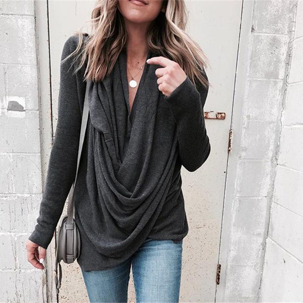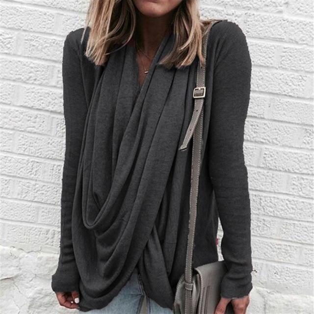 A women's shirt that has movement and style. Gathered fabric drapes down the front gives this top distinction. Long fitted sleeves adds contrast to the relaxed bodice. Pair with a skinny jean or leggings to complete the look.