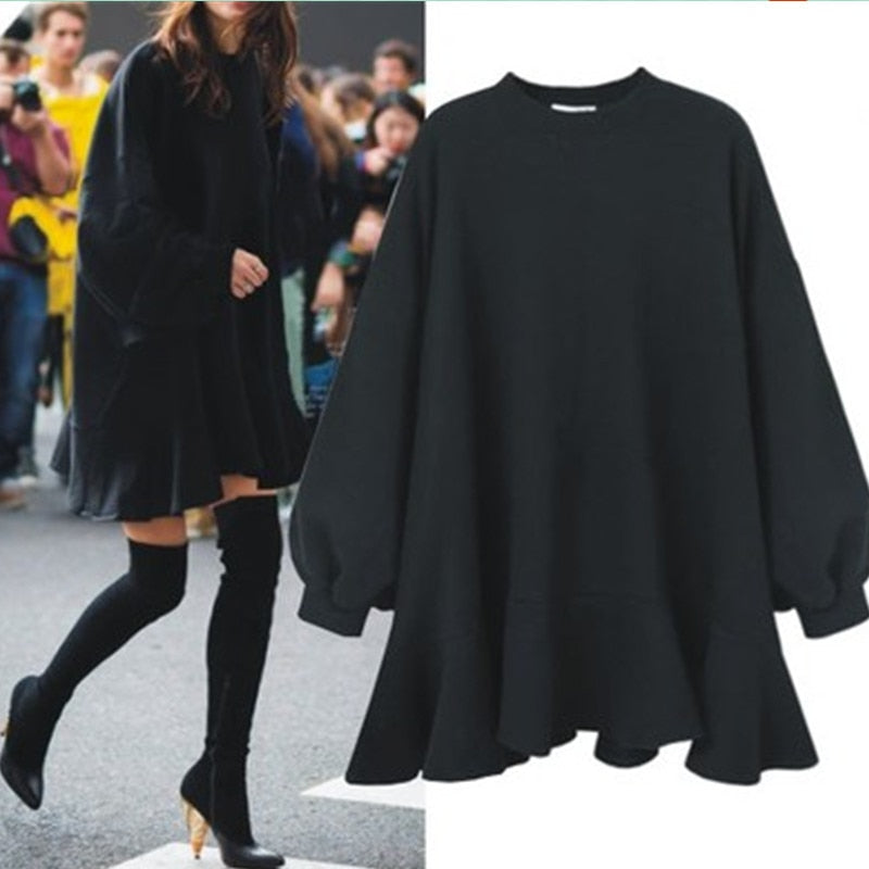 The little black shirt dress is what you need to show off your favorite knee high boot. Bell shape adds movement and a child-like femininity to this gorgeous dress. Crewneck with old world puff sleeves. A versatile dress that will be your go-to for all your outings.