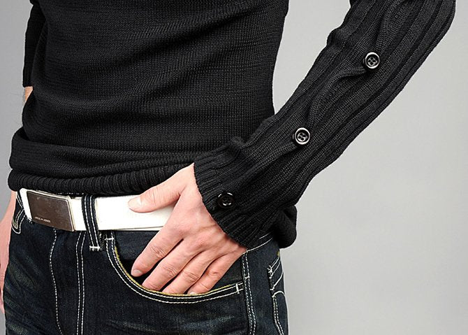 Sweater season is here. Get ready to for the cold weather months ahead with a sweater that's chic, comfortable and warm. Fold over detail extencs through the sleeve. Button details along the arm